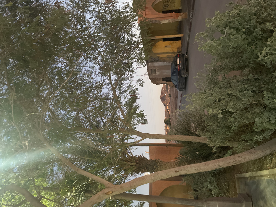 A street view shows a black car parked near an aged, arched building. A hill or mountain is visible in the distance under a twilight sky. Trees dominate the foreground, their branches partially obscuring the scene. One tree is a date palm. Dense foliage fills the right side of the frame. The scene appears to be captured from a slightly elevated perspective.
