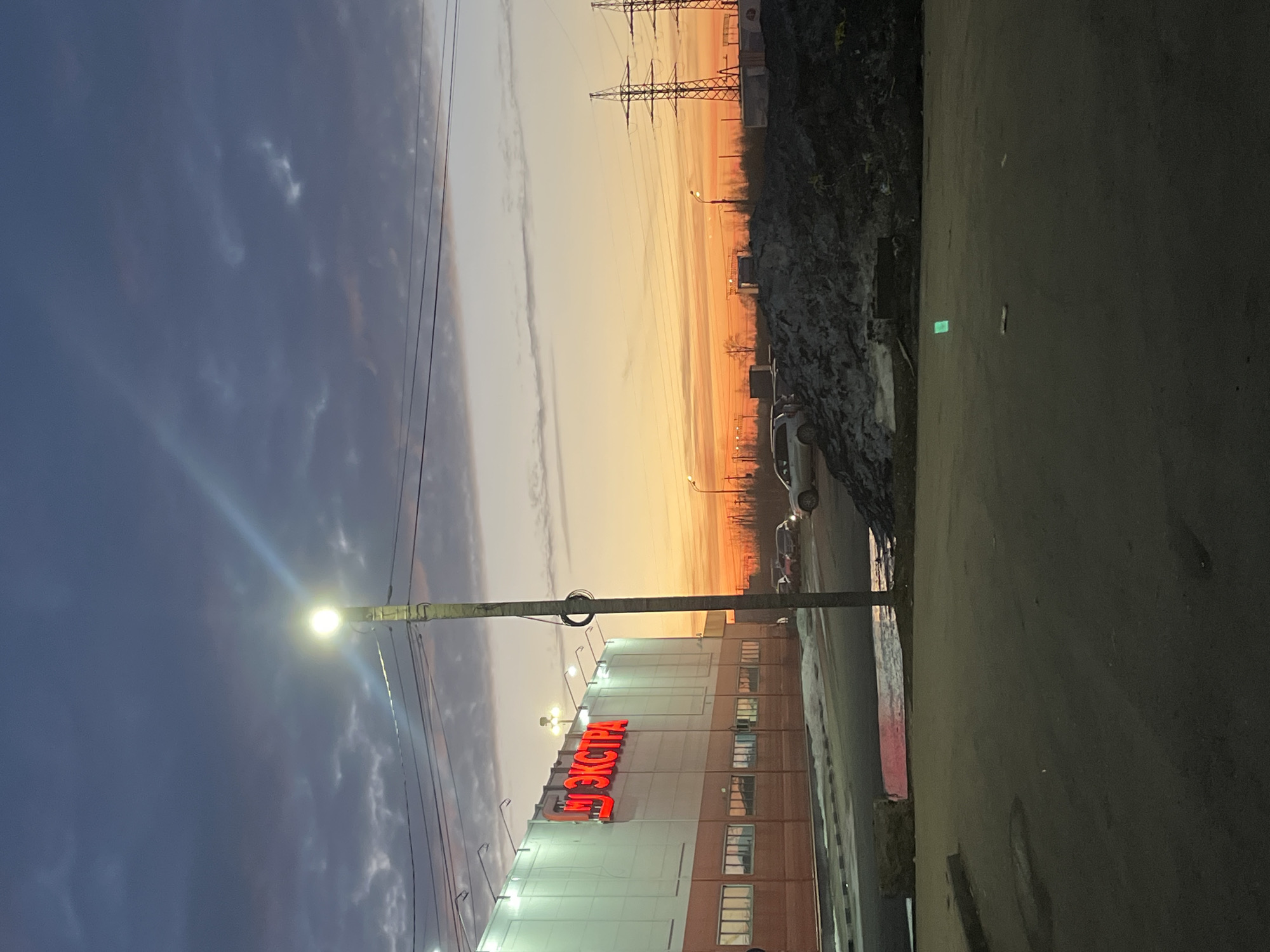 The scene depicts an urban landscape in Novo-Nikol'skoe, Russia, at either dusk or dawn, characterized by a vibrant orange and yellow horizon contrasting with a dark, cloud-strewn sky overhead. To the left, a large commercial building, identified by its illuminated red Cyrillic signage "ЭКСТРА" (EXTRA) on a white and orange facade, stands brightly lit. Multiple rectangular windows are visible along the lower section of the building. In the immediate foreground, a dark asphalt surface occupies the lower half of the frame, showing a faint green rectangular glow on the pavement in the lower right. A grey utility pole with a single, brightly illuminated streetlamp stands centrally, casting a strong light beam. Power lines extend from this pole across the sky. To the right, a substantial dark mound of earth or debris is prominent. Behind this mound and further right, several vehicles, including what appears to be a light-colored SUV, are visible on a paved area or road. In the distant background, silhouetted against the bright horizon, are multiple tall metal lattice structures, typical of high-voltage electricity pylons. Patches of snow or ice are present on the ground near the commercial building and alongside the road. No individuals are visible.