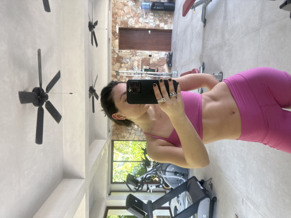 The scene depicts a female individual taking a mirror selfie inside a fitness center or gym in Playa Blanca, Mexico
