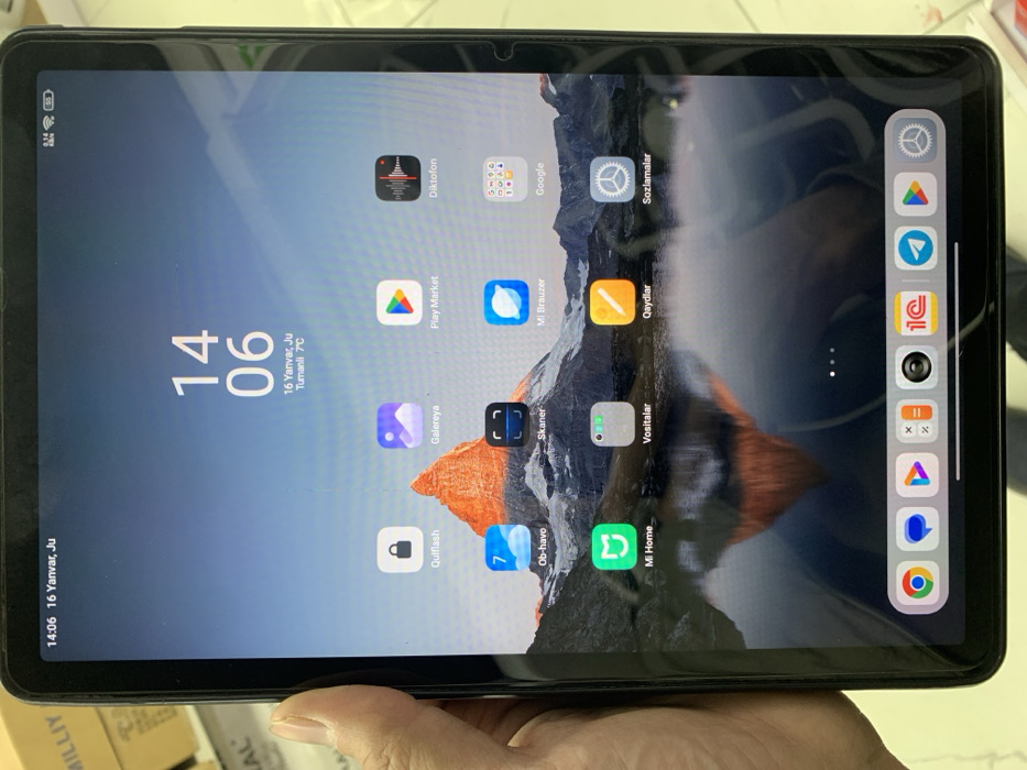 A black-framed tablet is depicted in portrait orientation, held by a human left hand. Its display shows the home screen, featuring a wallpaper of the Matterhorn mountain with an orange-illuminated peak, reflecting in a body of water. The digital clock prominently displays "14:06." Below this, the date reads "16 Yanvar, Ju" (January, Friday), and the weather forecast is "Tumanli 7°C" (Cloudy, 7°C), indicating an Uzbek language interface. Application icons are arranged on the screen, including "QulfFlash," "Galereya," "Play Market," "Diktofon," "Ob-havo" (Weather), "Skaner" (Scanner), "Mi Brauzer" (Mi Browser), "Google," "Mi Home," "Vositalar" (Tools), "Qaydlar" (Notes), and "Sozlamalar" (Settings). A persistent dock at the bottom of the screen contains icons for Chrome, Google Play, a calculator, a camera, "1C," Telegram, YouTube, and Settings. The tablet's status bar at the top right indicates network signal, Wi-Fi connectivity, and battery level. The human hand's fingers and thumb are visible gripping the left bezel of the tablet. The background is blurred, showing indistinct light-colored indoor surfaces and a portion of a cardboard box labeled "MILLIY" in the upper left. This scene is located in Andijan City, Uzbekistan, as indicated by the Uzbek language on the tablet's interface.