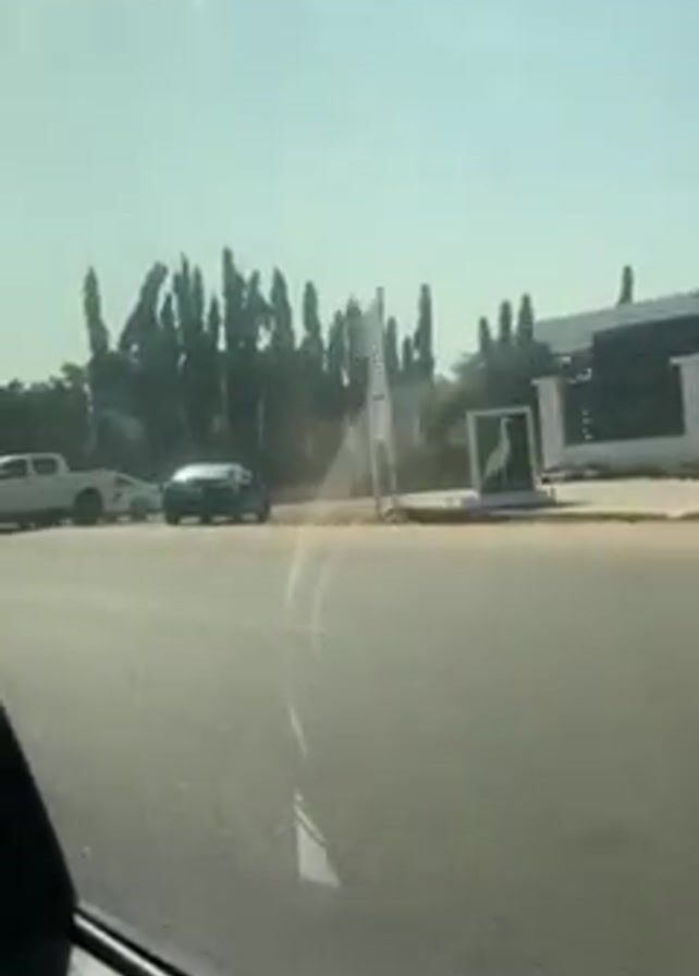 car traveling down a smooth asphalt road on a sunny day. The sky is a light, pale blue. On the right side of the road, there are various trees, including palm trees, and buildings that appear to be well-maintained. A white truck and a dark-colored sedan pass by on the road ahead. The interior of the car is visible, with the door panel and a reflection of the outside scene on the window. A lamppost with a modern design is seen along the roadside.