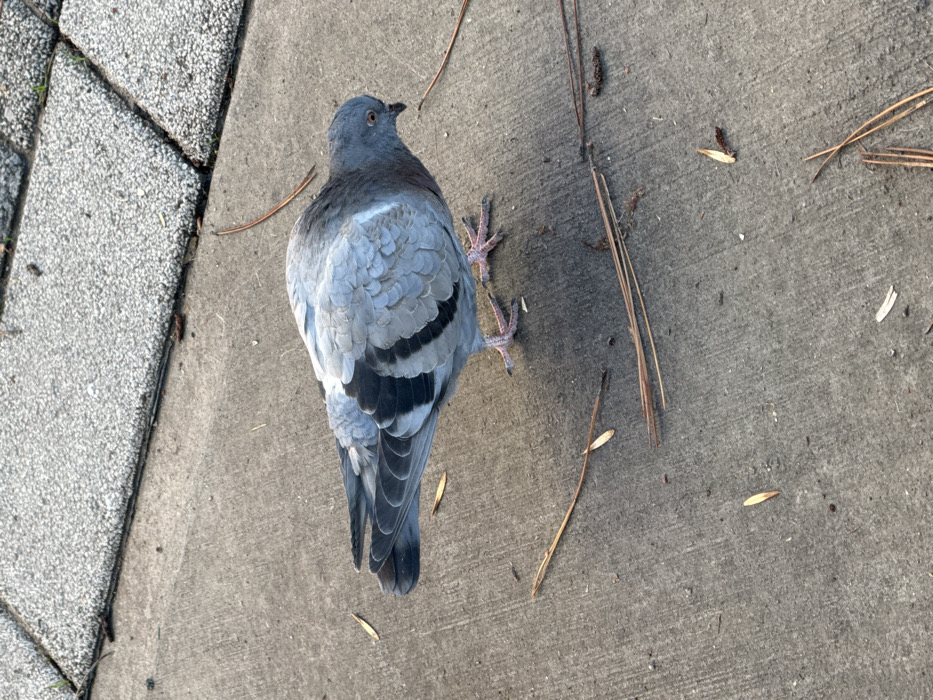 - "A pigeon lies on a gray concrete surface, back towards the viewer" by FM-7p9nD3, licensed under CC BY 4.0