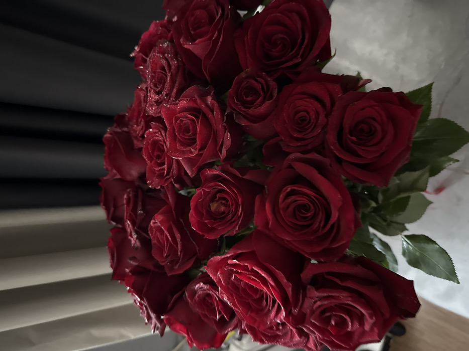 - "The image displays a close-up, top-down view of a dense bouquet of approximately twenty-five dark red roses, situated indoors in Bol'shie Mkhi, Russia" by FM-D8TNO2, licensed under CC BY 4.0