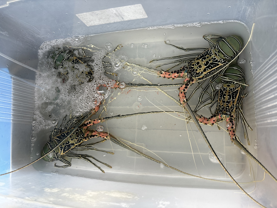 - "This image depicts at least four live spiny lobsters contained within a translucent light grey plastic tub filled with water, located in Ban Ko Li Pe, Thailand" by FM-bmo3E3, licensed under CC BY 4.0