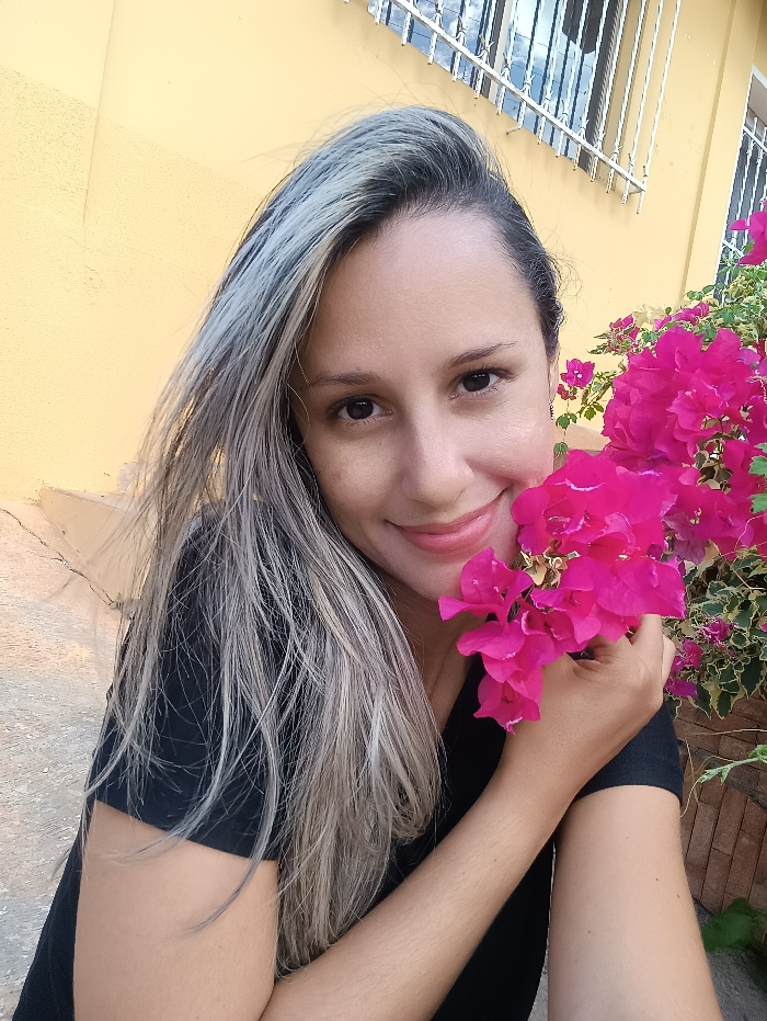 A woman with long, gray-streaked hair smiles at the camera. She wears a black shirt and stands beside bright pink bougainvillea flowers. A yellow wall is behind her. A window with white bars is visible near the top of the image. The photo captures a cheerful and natural moment outdoors.