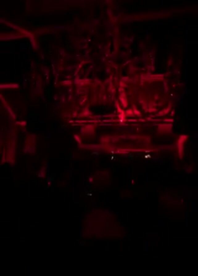 dimly lit room, possibly a nightclub, with a crowd of people in the foreground. The dominant color is red, emanating from lighting fixtures above the crowd. The light highlights some structure, possibly a bar or stage. The video lacks detail due to the low light conditions.