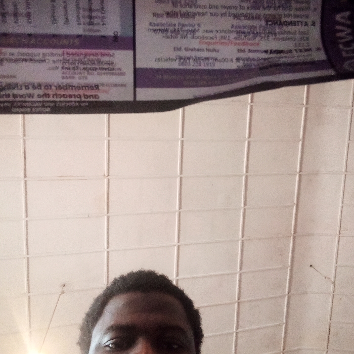 The image depicts a partial, low-angle view of a dark-skinned individual, likely male, with short, dark hair, whose eyes are visible and directed towards the camera. The dominant background is a white, grid-patterned tiled ceiling, which exhibits some minor discoloration. A bright light source is partially visible on the far-left side of the frame, originating from above. At the very top edge of the image, two printed documents are visible, partially obscured and seemingly affixed above the ceiling tiles. The document on the left contains text including "ACCOUNTS." The document on the right, partially inverted, displays fragments of text such as "ATTENDANCA," "Associate Pastor," "Eld. Graham Nuhu," "Enquiries/Feedback," and a phone number "0803 234 1913." The partial acronym "ECWA" is also discernible on the far right of this document. The presence of "ECWA" (Evangelical Church Winning All) and religious titles like "Pastor" and "Elder" indicates the environment is likely an indoor space within an ECWA church building or an associated facility. Given the prompt's reference to Abuja, Nigeria, the inferred location is an ECWA church establishment within the city of Abuja.