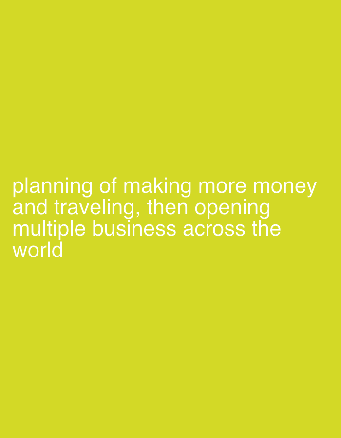 The image displays a digital graphic with a solid lime-green background. White sans-serif text is centered on the lower half of the frame. The text reads: "planning of making more money and traveling, then opening multiple business across the world". No people, subjects, objects, actions, or interactions are depicted within the image beyond the text itself. The environment is limited to the two-dimensional graphic display. The location is Unknown, Unknown.