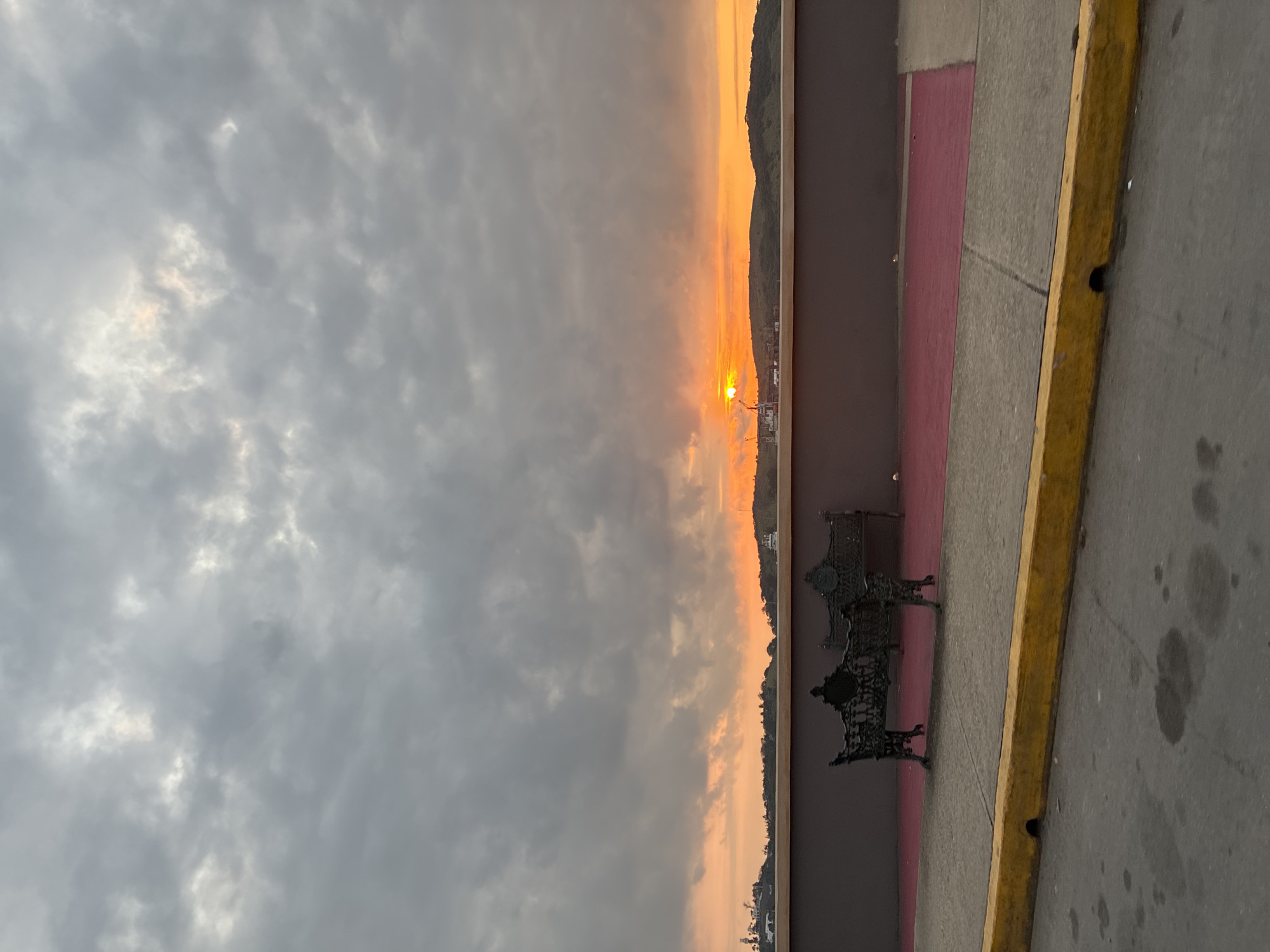 The scene captures a sunset over a distant landscape, viewed from an urban area in the city of Allende, Mexico. The sky occupies the upper two-thirds of the frame, dominated by an expanse of dense, grey overcast clouds. Below the cloud cover, a clear, vibrant orange sunset is visible on the horizon, with the sun's disc distinctly outlined against the lower edge of the clouds. Below the horizon, a series of dark, undulating hills and landforms are silhouetted against the orange glow. To the left, industrial structures, including at least one prominent crane, are discernible, indicating a port or developed coastal/riverine area. A small white vessel is visible on the distant water or land to the right. In the mid-ground, a dark, solid wall, possibly a retaining wall or building facade, extends horizontally across the image. Immediately in front of this wall is a paved area, part of which is colored a distinct reddish-pink. Two dark, ornate cast-iron benches, featuring intricate scrollwork on their backs and arms, are positioned on this reddish surface, oriented towards the sunset. The benches are unoccupied. The immediate foreground consists of a weathered yellow concrete curb, separating a grey concrete sidewalk from a dark asphalt road. The asphalt shows multiple irregular dark stains. A small, dark circular opening, consistent with a drain, is present in the yellow curb. No individuals or active interactions are visible in the depicted environment.