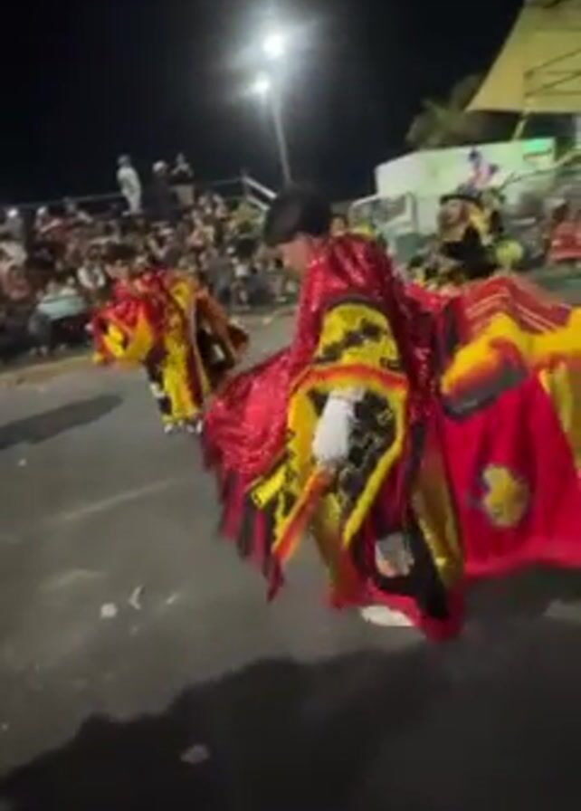 group of people performing a dance at night. They are wearing colorful costumes that are predominantly red, yellow, and black. The costumes have intricate designs and embellishments, some with sequined elements. The dancers are moving on a paved surface, possibly a street or stage. There are spectators in the background, some sitting in elevated seating. The area is illuminated by streetlights and some light emanating from a structure in the background. The atmosphere appears festive.