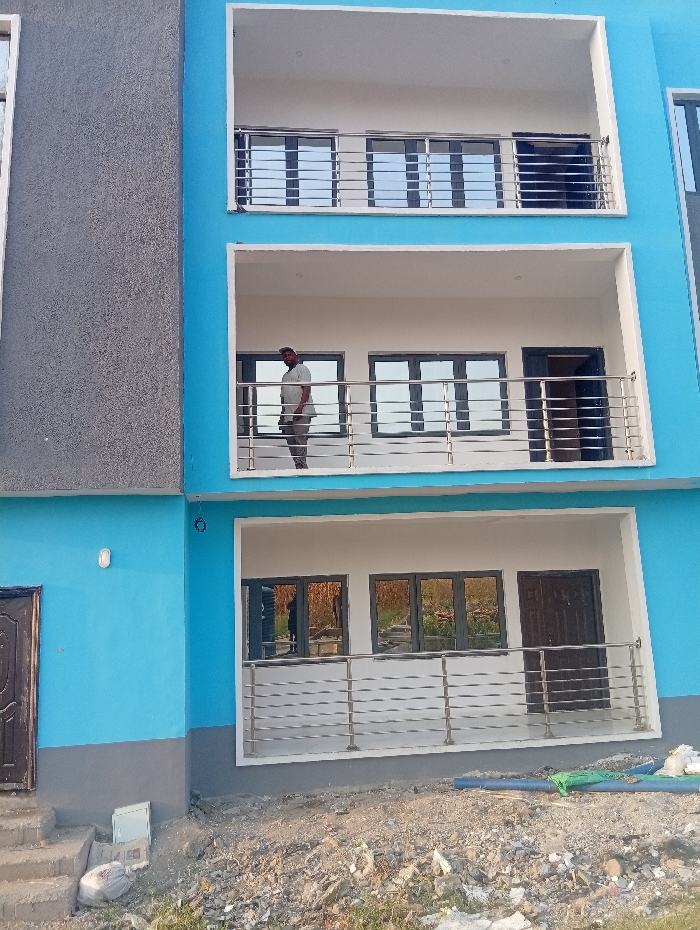A three-story building is displayed in the image. The building features a gray textured wall on the left side and a light blue wall on the right. Each story has a balcony with stainless steel railings. Windows and doors on each floor are visible. A man stands on the middle floor's balcony. The ground area in front of the building appears to be under construction with visible dirt and debris. The building appears newly constructed or renovated.