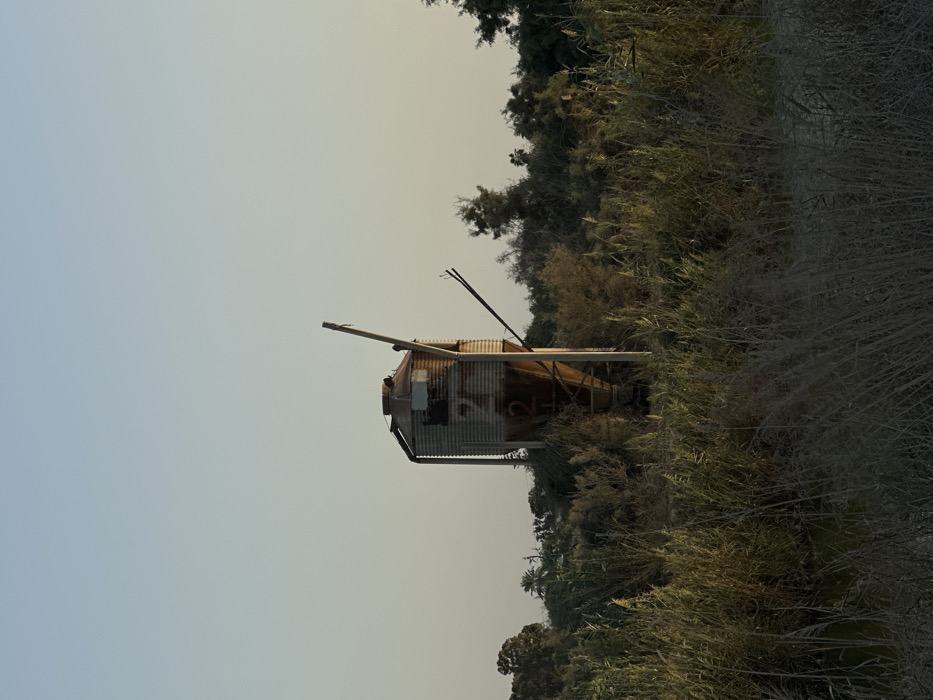 The image displays a weathered, cylindrical corrugated metal silo, prominently positioned within an overgrown natural environment in the Hof HaCarmel Regional Council, Israel