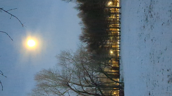 The image displays a winter landscape at dusk or night in a park-like setting within the city of Unknown, Unknown. A bright, circular, yellowish-white celestial body, consistent with a moon, is visible in the upper-center of a pale blue sky. In the left midground, several tall deciduous trees with bare branches stand, appearing dark against the lighter sky and background. Across the center-right, a dense line of dark coniferous trees forms a prominent horizontal band. The foreground and midground are covered uniformly in a layer of white snow. Behind the line of coniferous trees, numerous warm-toned artificial lights are visible, casting illumination into the distance and onto the lower sections of the trees. No individuals, animals, or specific actions are discernible within the scene. Sparse, out-of-focus bare tree branches are present in the upper corners of the frame.