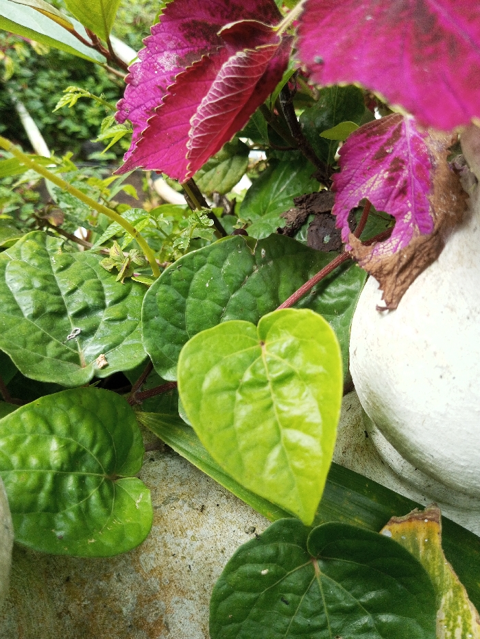 The image presents a close-up, outdoor botanical scene within the city of Mindat, Myanmar. The primary subjects are various plant leaves and a partial white object. In the foreground and mid-ground, numerous heart-shaped green leaves, consistent with the appearance of *Piper betle*, exhibit prominent venation and varying shades of green. Above these, vibrant magenta and purple leaves with serrated margins, indicative of *Coleus scutellarioides*, are visible; one purple leaf on the upper right side displays a circular hole and brown, desiccated edges. A white, textured, rounded object, resembling a ceramic pot or planter, is partially visible along the right side of the frame. The ground beneath the foliage consists of a light grey, rough-textured surface, possibly concrete or stone. Blurred green foliage occupies the background. No individuals or animals are present in the scene.