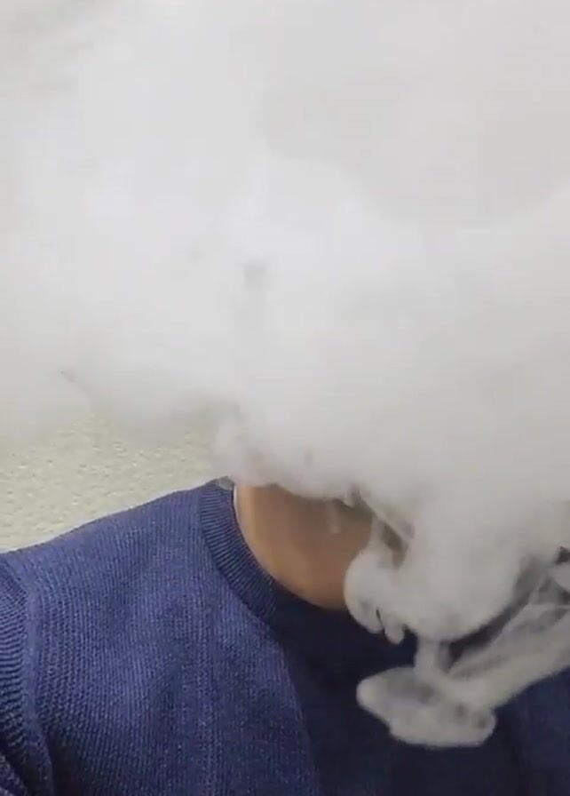 A person wearing a blue sweater exhales a large cloud of white smoke