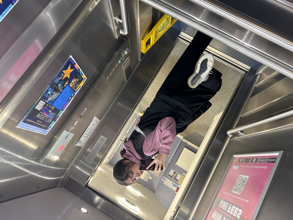 - "Inside an elevator, a person in black pants, pink long-sleeved shirt, and a dark jacket stands facing the mirrored wall, taking a selfie with a smartphone" by FM-Gswv13, licensed under CC BY 4.0