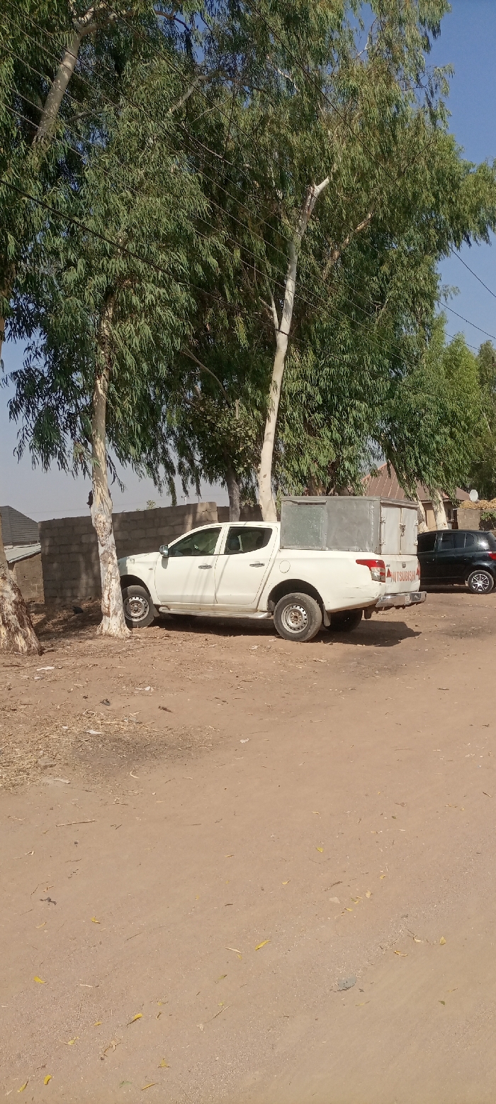 The scene depicts an outdoor, unpaved area in Howayi, Nigeria. The foreground consists of light brown, sandy dirt with scattered small debris. A white Mitsubishi pickup truck, equipped with a custom-fabricated, unpainted metal utility box covering its bed, is parked on the dirt, oriented left. The vehicle displays "MITSUBISHI" branding on its tailgate. Partially visible to the right and behind the white truck is a dark-colored hatchback vehicle. Multiple tall trees with slender, pale trunks and dense green foliage dominate the midground and upper frame. Overhead utility lines are visible crisscrossing through the tree canopy. A low wall constructed of grey concrete blocks is present in the midground, behind the white truck. Distant structures, including a dark roofline, are partially visible in the background. The sky is clear blue. No individuals are visible.