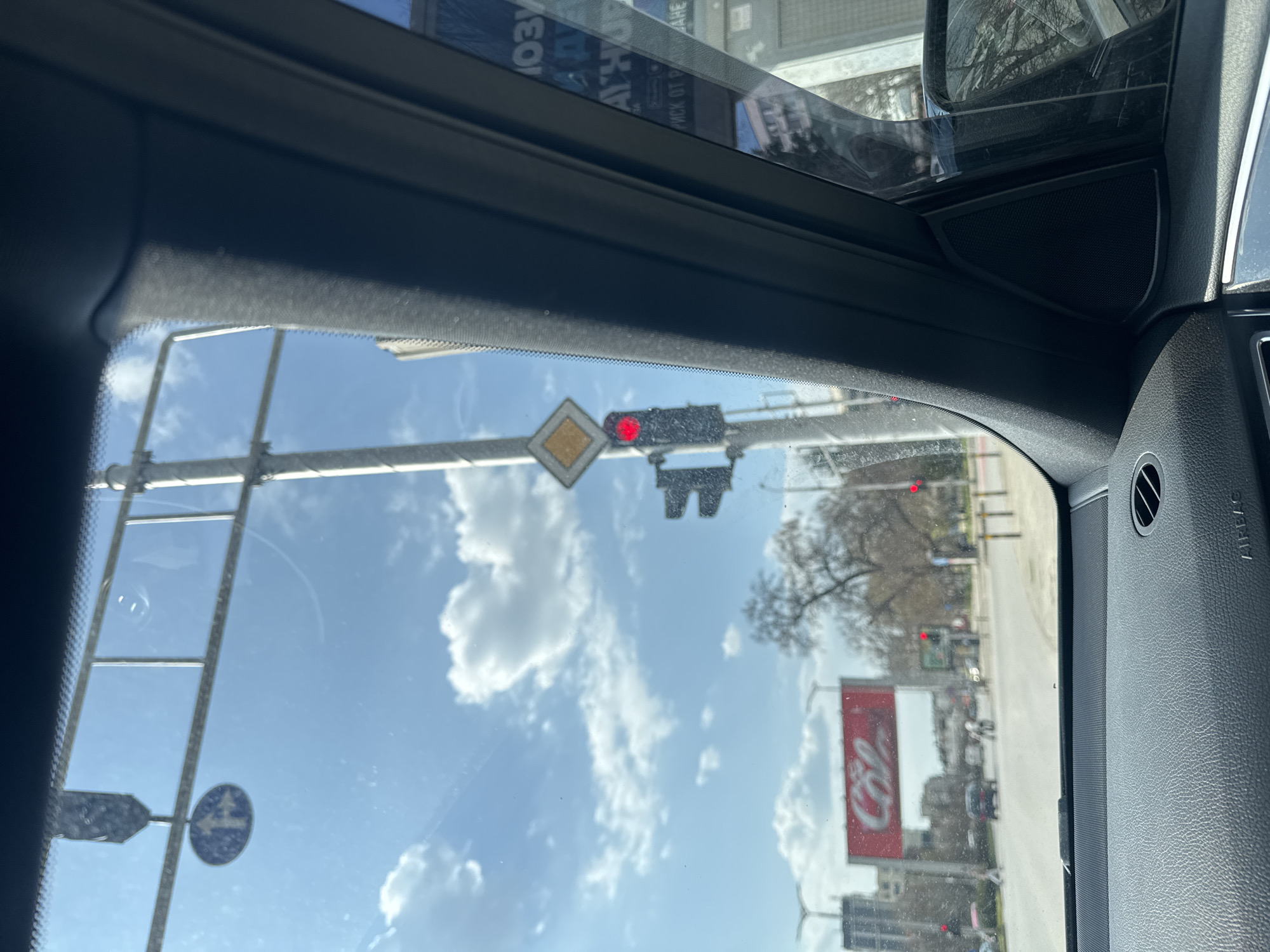 The image depicts an urban street scene in Plovdiv, Bulgaria, observed from the interior of a vehicle looking forward through the windshield. The specific location is the intersection of Bulevard Ruski and Bulevard Svoboda. The foreground displays the vehicle's dark-textured dashboard, an air vent, and an "AIRBAG" inscription. The windshield, showing minor dust and smudges, frames a clear, sunny sky with scattered cumulus clouds. At the center-right, a vertical traffic light exhibits a red signal. Above it, a yellow diamond-shaped "priority road" sign is visible. Further to the left, a blue circular sign with a white arrow indicating "straight ahead" is mounted on a supporting structure. The road extends into the mid-ground, where several vehicles are visible, including a dark sedan and a person on a bicycle or scooter, stopped at the intersection. On the left side of the frame, a large red billboard with the "Coca-Cola" logo is prominently displayed on a building. Beyond this, additional buildings and bare deciduous trees are visible. On the right, reflections in the vehicle's side window or mirror show a building facade with partial Cyrillic text and tree branches. The vehicle's dark A-pillar and a portion of the side mirror are also visible on the right.