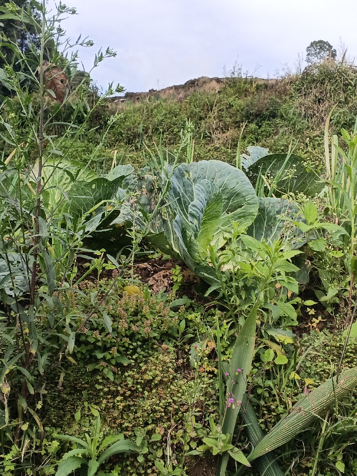 Lush green vegetation dominates the foreground, featuring large cabbage heads amidst various weeds and grasses