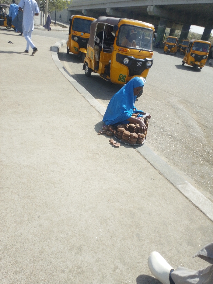 The scene depicts a sunny, urban environment in Tarauni, Nigeria, focused on a street-side vendor and passing traffic. In the foreground, a person, likely female, wearing a blue head covering and garments, sits directly on the paved ground next to a concrete curb. In front of her is a circular metal tray containing a dense stack of numerous brown, bun-shaped food items, presumably for sale. A pair of brown sandals lie adjacent to the tray. The perspective suggests the photographer is standing or sitting nearby, with a partial view of a white shoe and pant leg visible in the lower right corner. Behind the vendor, a paved road stretches into the distance. Several yellow three-wheeled auto-rickshaws, commonly known as Keke Napep, are visible. One such vehicle, marked with "GML" on its side, is positioned close to the curb directly behind the vendor, with occupants discernible inside. Further down the road, additional yellow auto-rickshaws are present, some appearing to be in motion or parked. On the left side of the road, a male individual in a white robe and blue trousers walks away from the camera. Another figure in blue clothing is visible further back on the left, and a dark-robed figure is in the distant left background. The background features a large concrete overpass or bridge spanning across the scene. The sky is clear, and the overall lighting indicates bright daylight.