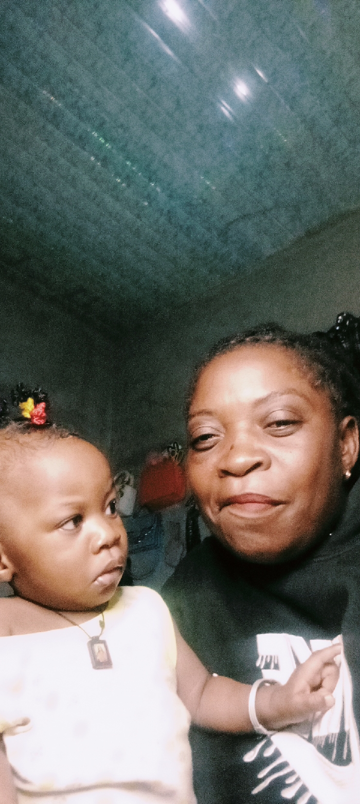 A woman takes a selfie with a young child. The child has a single flower clip in its hair and wears a necklace with a rectangular pendant. The woman wears a dark hoodie and has her hair pulled back. The background is dark and indistinct, with a patterned ceiling visible. The photo is a close-up, focusing on the faces of the two subjects.
