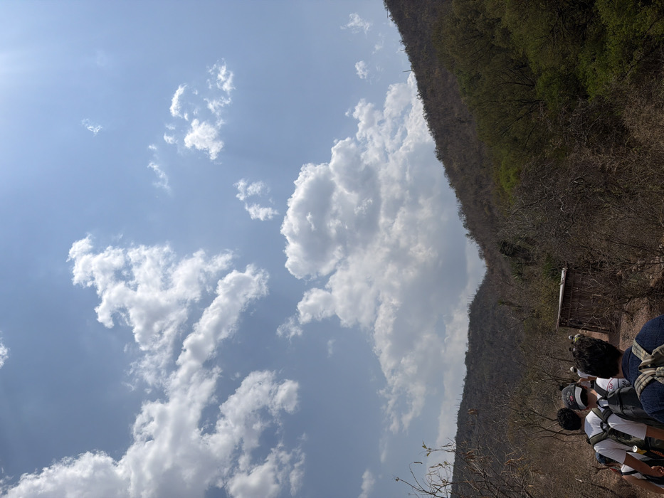 The image displays a group of at least five individuals walking on a reddish-brown dirt path through an arid, mountainous landscape in San Agustín Ahuehuetla, Mexico. The subjects, observed from behind, are wearing casual clothing and backpacks, suggesting a hike or trek. The terrain features hills covered predominantly in dry, brown brush and scattered cacti, with patches of greener foliage visible on the lower right hillside. A small, rustic wooden shack or shelter is situated off the path to the right, partially obscured by vegetation. The overhead sky is clear blue, dotted with numerous white cumulus clouds, and a bright sun glare is visible in the upper right portion of the frame.