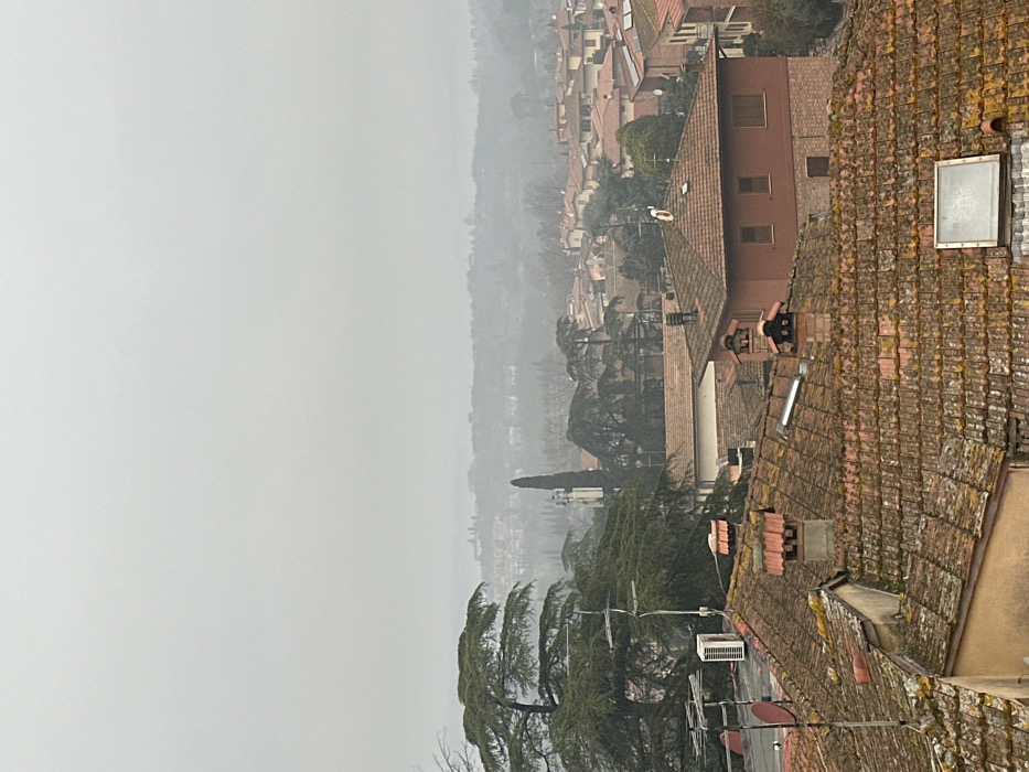 This image depicts an elevated, static view over a residential section of Sinalunga, Italy, under uniformly overcast and hazy sky conditions