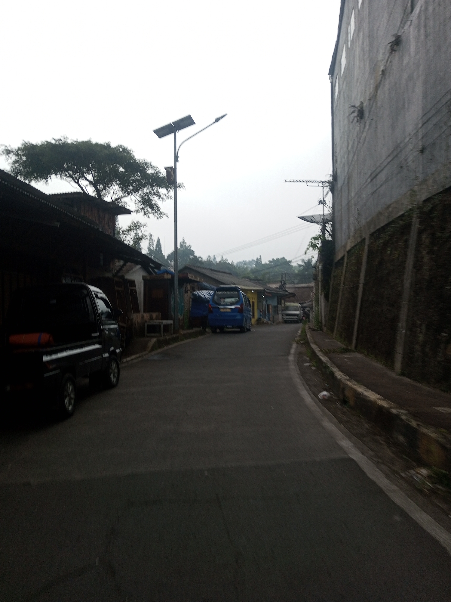 The image displays a street scene in Kan Beit, Myanmar, under an overcast sky. A dark asphalt road, gently curving to the right, runs through the center. On the left side, a black pickup truck with an orange rolled object in its bed is parked alongside a series of single-story buildings featuring corrugated metal roofs. A large tree with dark green foliage is visible above these structures, and a street light equipped with a solar panel stands further down. The right side of the road is bordered by a tall, multi-story concrete building that functions as a retaining wall, exhibiting patches of moss and vines, with small rectangular window openings visible higher up. A concrete curb and gutter line the road on the right, with a white plastic bag resting near the curb. Further down the street, a blue minivan is present, followed by a lighter-colored vehicle in the distance. Antennas, including a satellite dish and a Yagi antenna, are attached to the concrete building. Hills covered in trees are visible in the background beneath the bright, overcast sky. No individuals are depicted.