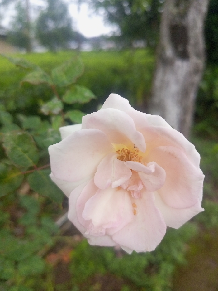 A single, light pink to pale peach rose is centrally and sharply focused in the foreground, displaying open petals and yellow stamens. A small, dark insect, possibly an ant or tiny spider, rests on the stamens in the flower's core. Several elongated, light-brown specks are observed on the lower petals. The background is out of focus, revealing blurred green vegetation, a light-barked tree trunk to the right, and distant, indistinct structures under an overcast sky, indicating an outdoor setting in Zee Pin Kone, Myanmar.