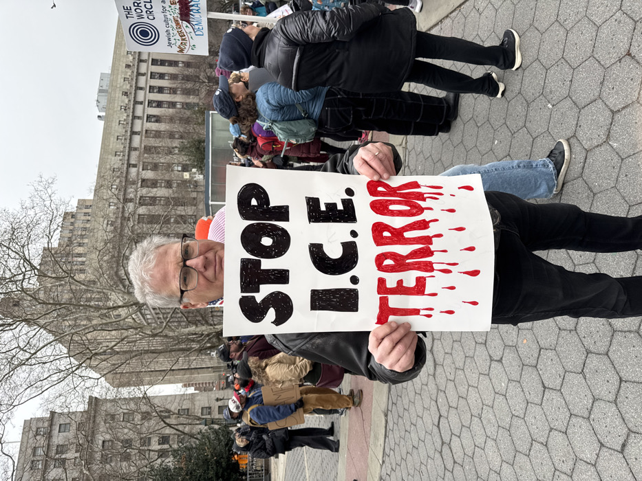 A demonstrator holds a sign that reads "STOP I.C.E. TERROR" in bold letters, with red blood-like drips. The person is fair-skinned, wearing glasses and a leather jacket. Behind the demonstrator, other signs are visible that read "THE WORLD CIRCLE Jewish culture for all" and "WORKER RENTS & DEMIC RAC." The demonstration takes place on a brick-paved area, with people in winter clothing and a tall building in the background.