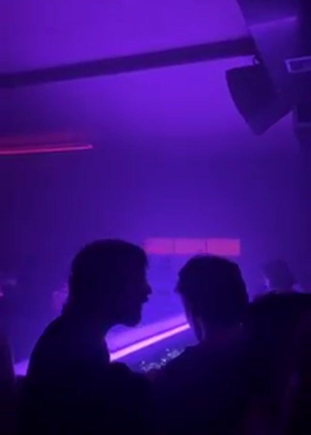 dimly lit nightclub or music venue. Purple lighting illuminates the scene, creating a hazy atmosphere with some smoke or fog. A group of people is gathered, likely dancing or listening to music. Two people, silhouetted against the DJ setup, appear to be talking to each other. A sound system is visible overhead.