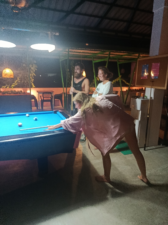 An elevated, open-air or semi-open covered area, possibly a bar or common space, at night in Unknown, Sri Lanka. The scene is illuminated by overhead industrial pendant lights and a warm-toned woven lantern. In the foreground and center, a woman with long light-colored hair, wearing a loose pink top, is positioned to take a shot at a pool table. Her left hand rests on the blue felt surface, guiding a cue stick towards a white cue ball. A red, blue, and yellow ball are also visible on the table. She is barefoot. Behind her, to the left, a bearded man in a dark sleeveless top stands upright, holding a pool cue vertically. To his right, a woman with light brown hair tied back, wearing a white long-sleeved top, stands with her arms crossed, smiling. The floor is concrete. The ceiling consists of a dark, corrugated metal roof supported by green metal framework. In the background, beyond the pool table, dark outdoor chairs and a table are visible. To the far right, a light-colored pillar displays a cork board with two framed notices and a stand with two torch-like lights. Several cans rest on a lower ledge. A small green mat is on the floor near the right.