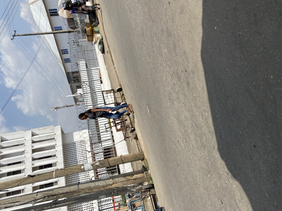 The image captures an urban street scene in Ibadan, Nigeria, under a clear sky with scattered clouds