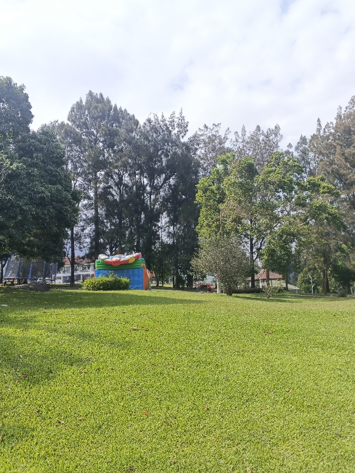 The image presents an outdoor scene within the city of Bagochen Boolingpang Ueling, Bhutan, under an overcast sky. The foreground consists of a well-maintained, bright green lawn extending from the bottom of the frame to the midground. Positioned in the midground, slightly left of center, is a colorful inflatable structure. Its base is predominantly blue and orange, with upper sections displaying green, yellow, red, and white elements. Directly behind this inflatable is a dark green shrub. Further to the left and in the background, several multi-story buildings and a partial mesh fence or netting structure are visible, partially obscured by trees. To the right of the inflatable, a smaller tree with lighter green foliage stands, and a reddish-brown gazebo is partially discernible behind a cluster of trees. The background is characterized by a dense line of varied trees, including tall, dark green conifers and other broadleaf trees, forming a natural horizon. No individuals are present or engaged in activities within the captured scene.