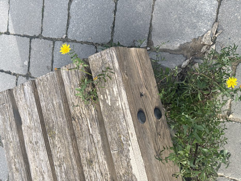 The image displays a close-up, angled view of a weathered wooden structure, likely part of a bench, located on a paved surface in Zona Eixample, Spain. The wooden component consists of multiple horizontal planks, exhibiting a faded, greyish-brown color, distinct wood grain, and minor surface wear. Two round, black caps or bolts are visible, embedded flush into the front-facing side of a lower wooden plank. Green vegetation, comprising various leafy plants and two prominent bright yellow flowers resembling dandelions, grows profusely from the gaps between the wooden planks and around the base of the structure. The ground consists of grey paving stones, irregularly shaped and tightly fitted, showing visible grout lines and some soil or debris accumulation between them. The scene is devoid of human or animal presence. Natural daylight illuminates the area.