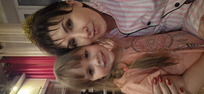 A close-up indoor photograph depicts two smiling females, an adult and a child, positioned shoulder-to-shoulder, looking directly at the camera. This scene is located in Ust-Ilimsk, Russia. The adult female, positioned on the right, appears to be in her 30s or 40s. She has dark, short hair styled with bangs, topped with a small, golden, spiky festive ornament. Her facial features include defined eyebrows and dark eye makeup. She wears a light pink and white vertically striped collared shirt, featuring black buttons and black piping along the collar and placket. Her expression is a soft smile. The child female, positioned on the left, appears to be approximately 4-6 years old. She has light brown, shoulder-length hair with bangs, and a portion is styled into a braid secured with a pink elastic band on her left side. She wears a peach-colored short-sleeved t-shirt and a silver-colored chain necklace with a small dark pendant. A temporary tattoo resembling a dreamcatcher with "MOON" written inside its web and feather elements is visible on her left forearm. Her fingernails are painted red. Her expression is a broad smile, showing teeth. The background elements indicate an indoor residential setting. Visible behind the individuals are sections of a reddish-pink curtain and a lighter, possibly beige, curtain, both featuring dark grommets at the top. A white ceiling molding is present above the curtains. To the far right, a window or door frame allows a glimpse of a dark exterior, suggesting nighttime or low light conditions. In the upper left background, a metallic or reflective surface is partially visible. The overall lighting is consistent with indoor artificial light.