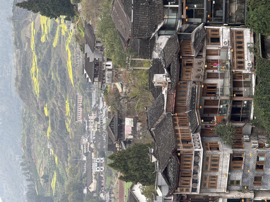 An expansive elevated view captures a densely built section of Furong, China, situated on a steep hillside. The scene is dominated by numerous multi-story structures constructed into the terrain, primarily exhibiting traditional Chinese architectural styles with dark grey tiled roofs featuring curved eaves. Building exteriors vary, displaying grey brick, stone, and some white plastered sections, accented by numerous reddish-brown wooden window frames, often with intricate lattice designs. In the foreground, a cluster of traditional buildings shows multiple balconies. Some balconies feature glass railings, while others have more traditional wooden or solid railings. Orange and red spherical lanterns hang from eaves and balconies across several structures. Air conditioning units are visible on the exterior walls of multiple buildings. On one central balcony, two individuals are present; one, wearing a reddish-pink top, stands near the railing facing right, while another is partially obscured behind them. A nearby balcony features two chairs and a small table. Further to the left and slightly elevated, another building displays white laundry hanging from a line or railing. Utility poles and electrical wires are visible interspersed among the buildings. The background reveals a series of terraced hillsides ascending into the distance, predominantly covered in bright yellow flowering crops, indicative of rapeseed or similar agriculture. Evergreen trees are scattered throughout the town and on the slopes, alongside deciduous trees with minimal foliage. The sky is overcast, casting a soft, diffuse light over the entire landscape.
