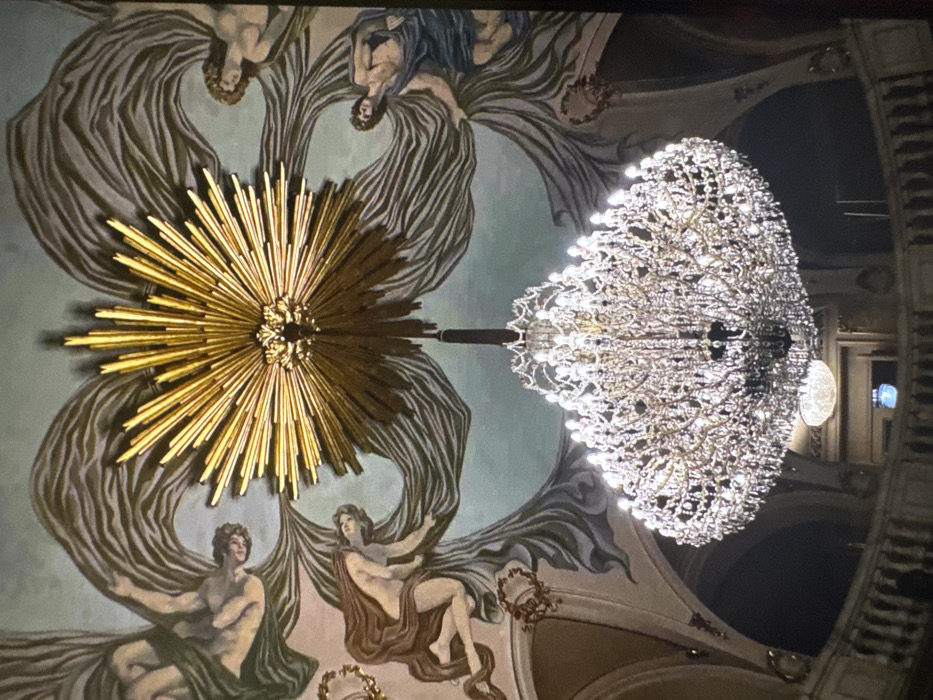 This image captures an elaborate interior ceiling and lighting fixtures in a building in Cherven Bryag, Bulgaria. The central focus is a large, multi-tiered crystal chandelier illuminated brightly, suspended from the ceiling. Directly above the chandelier, affixed to the ceiling, is a gilded sunburst motif with numerous radiating gold spikes. Surrounding the sunburst and extending across the ceiling are frescoes depicting classical figures. On the left side, two figures, one prominent and mostly nude draped in brown fabric, are depicted amidst flowing material. On the right side, two figures, one prominent and mostly nude draped in blue fabric, are also shown amidst flowing material. The fresco background is a light blue-green. Below the main chandelier, a partial view of an ornate architectural space is visible, including a dark curved balustrade suggesting a balcony or upper tier. Further in the background, a smaller, circular chandelier is dimly visible. Architectural arches and decorative elements are also present on the upper side walls. The overall lighting suggests an indoor setting with artificial illumination.