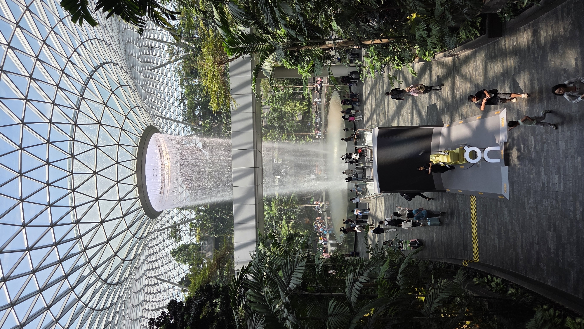 The image depicts the HSBC Rain Vortex, a large indoor waterfall, located in the Jewel Changi Airport in Singapore. The waterfall cascades from a circular opening in the glass and steel dome of the building. Lush greenery surrounds the base of the waterfall. Many people, including adults and children, are walking or standing around the base. A black and grey structure with the letters "OC" in white is nearby, with a person standing next to it. A few people are walking near the structure. The background includes views of the complex's architectural design, revealing its multi-level structure, and the surrounding tropical vegetation. The overall environment suggests a popular tourist attraction or public space within a transportation hub.