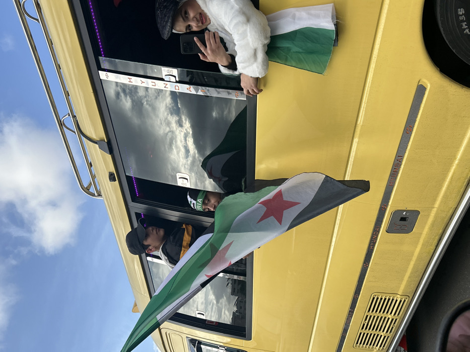 In Kafr Sousa Municipality, Syria, a bright yellow Hyundai minibus is depicted outdoors under a partially cloudy blue sky. Three individuals are visible leaning out of the vehicle's windows. On the left, a young male wearing a black baseball cap and a dark jacket with a yellow stripe looks towards the right. A Syrian Arab Republic flag, characterized by horizontal green, white, and black stripes with two red stars in the white band, is draped from his window, extending downwards. Next to him, a partially visible individual wears a green headband inscribed with "SYRIA" in white lettering, also leaning out. On the right, a female wearing a white fluffy jacket, a dark patterned hat, and a light headscarf is smiling and holding a smartphone (consistent with an iPhone model) in her left hand, pointed towards herself, indicating a selfie or recording action. A smaller green and white flag is draped from her window. The yellow minibus features a silver roof rack, "HYUNDAI" branding visible on its side and window frame, a side ventilation grille, and purple LED strip lighting illuminating the interior along the top of the windows. Reflections of clouds are evident in the vehicle's windows.