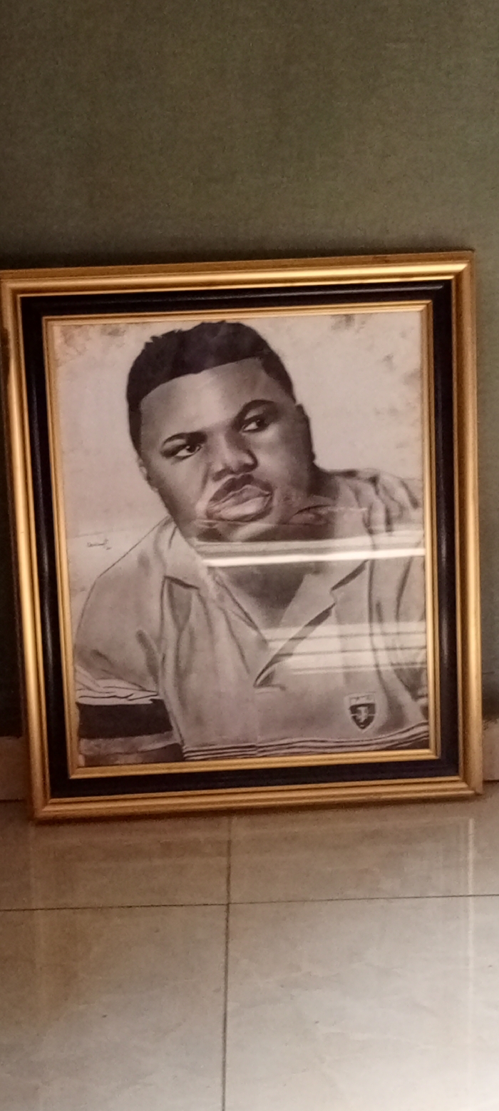 The scene is indoors, located in the city of Unknown, Unknown. A rectangular framed artwork rests on a light-colored tiled floor, leaning against a plain olive-green wall. The artwork is a black and white charcoal or pencil portrait of an adult Black male, depicted from the chest up, looking upward and to the viewer's left with a pensive expression, his mouth slightly ajar and lips pursed. He has a short, dark haircut and a subtle mustache. The subject wears a collared polo-style shirt with horizontal stripes on the sleeves and a small, shield-shaped emblem on the left chest. A faint signature is visible in the lower-left corner of the drawing. The frame consists of an outer gold-colored border and an inner black border, with a glass covering that exhibits reflections. The floor tiles are large, square, and light-toned, with visible darker grout lines. No individuals or active interactions are present in the image.