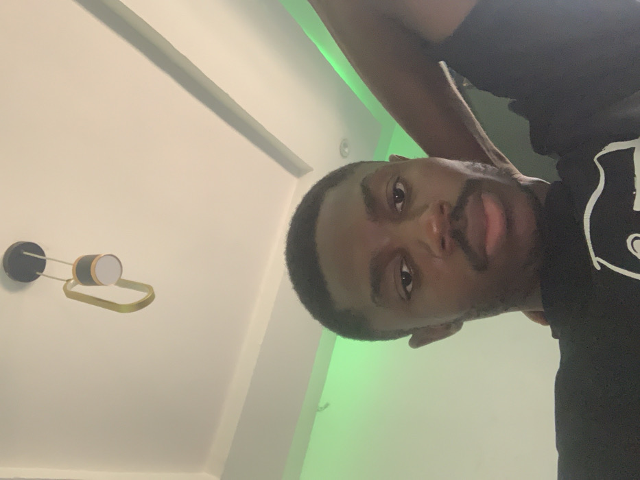 A male individual with dark skin, short dark hair, a mustache, and a short beard is depicted from the chest up, looking directly at the camera with a neutral expression. He is wearing a black t-shirt with a partial white graphic design visible on the chest. His right arm is bent, with the hand positioned behind his head. The background consists of a white ceiling with a modern ceiling light fixture in the upper center, featuring a black base, a gold-colored geometric frame, and a cylindrical light source. A segment of the upper left background displays a white wall or ceiling recess illuminated by a green light source. The scene is an indoor setting. The specific location within the city of Jos, Nigeria, cannot be determined from the visual evidence.