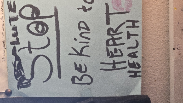 A light blue, rectangular piece of paper is affixed vertically to a tan, textured surface, likely a corkboard or fabric wall, with a brass-colored pushpin in its upper left corner. The paper displays handwritten text in black marker. The top line reads "ABSOLUTE" with the first three letters partially obscured by a dark smudge or overwriting, followed by "Stop" in a larger, stylized script, underlined by a thick horizontal stroke. Below this, "BE Kind to" is written in standard block letters. The final line of text, also in block letters, reads "HEART HEALTH." To the right of the word "HEALTH," a distinct red lipstick print is visible. Below the textured surface, a lighter, smoother horizontal surface is partially visible. No people are present, and the image does not provide sufficient contextual details to determine a specific location within Lompoc, United States.