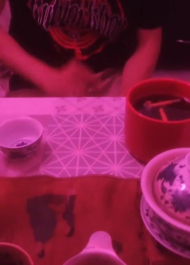 A person wearing a black t-shirt with a red circular graphic on the front is seated at a table. The table is covered with a grey geometric patterned mat, and beneath it, a red surface. On the table are several ceramic tea cups and pots, some of which are being used to prepare tea. The tea is being poured from a clear glass teapot into a small teacup. The scene is lit with a red or pink light, which gives the video a distinct hue.
