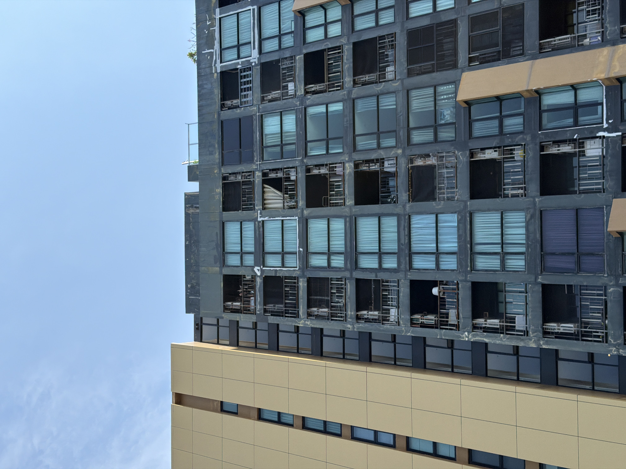 The image displays a low-angle view of two adjacent multi-story buildings in Phuket City Municipality, Thailand, against a clear blue sky. The building on the left features a modern, light beige facade composed of rectangular panels and vertical arrangements of narrow, dark-framed windows. The taller building on the right is dark grey, exhibiting a weathered appearance with numerous white streaks and splatters, suggesting ongoing renovation or deterioration. This building comprises multiple floors, each typically featuring a grid of dark-framed windows and small balconies with dark metal railings. Several balconies on the dark building contain visible white air conditioning condenser units. Some balcony areas appear partially stripped or under construction, with exposed structural elements. A white, cylindrical object, possibly a lamp or container, is visible on one mid-level balcony, and a light-colored frame or rack is present on another. Most windows are fitted with light blue or white curtains, some partially drawn. No individuals are clearly identifiable within the frame.