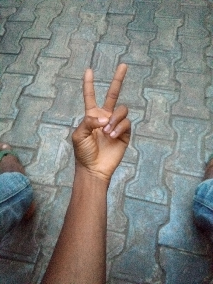 A right human hand, exhibiting a medium-dark skin tone, is centered in the upper mid-ground, extended upwards and forming a V-sign with the index and middle fingers. The thumb and remaining fingers are curled into the palm. The background consists of a uniformly patterned grey interlocking concrete paver surface. In the lower left quadrant, a portion of a leg covered by blue denim jeans is visible, with a green flip-flop on the foot. A similar partial view of a leg in blue denim jeans is present in the lower right quadrant. The scene is located in Bukuru, Nigeria.