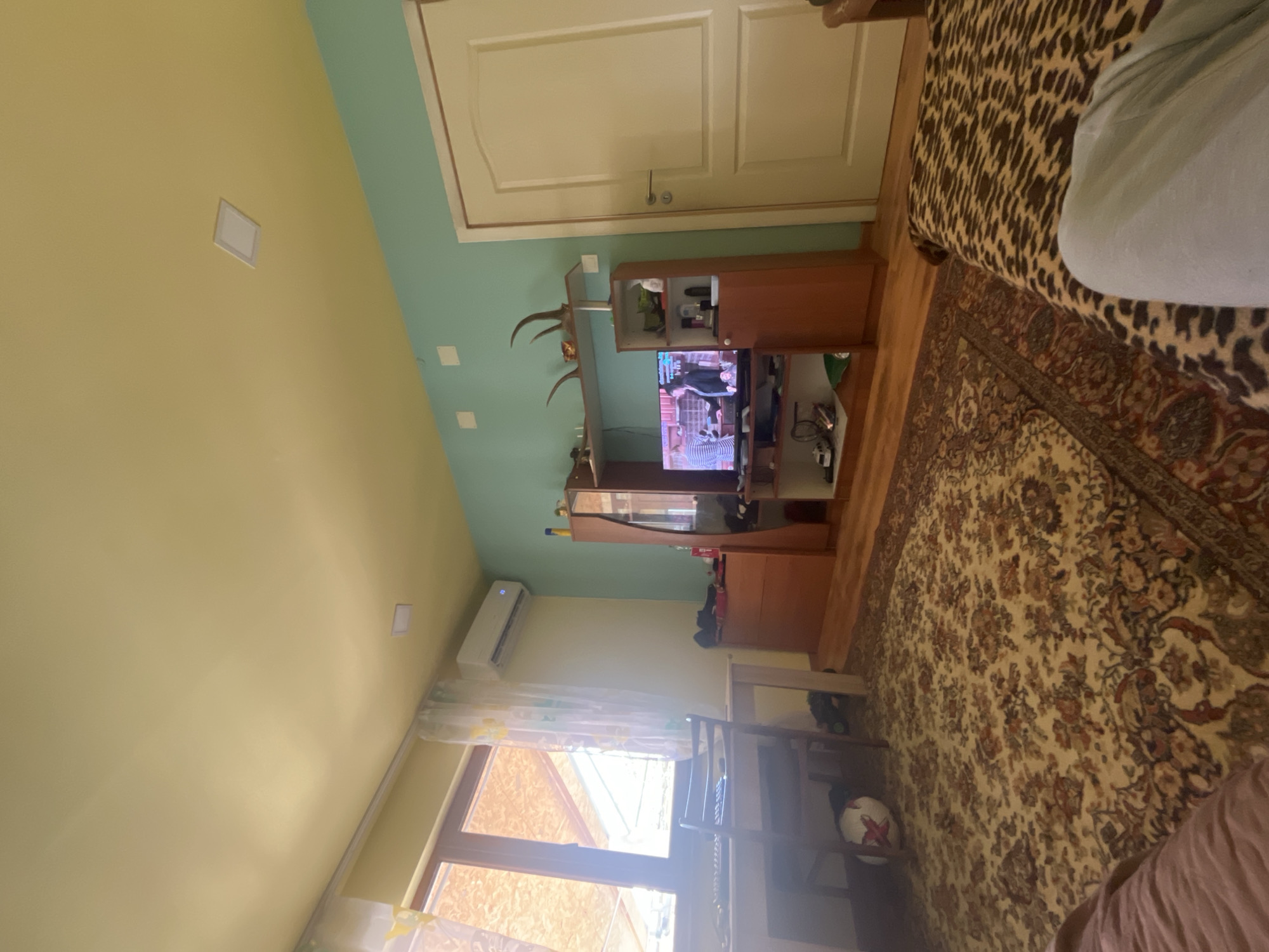 n interior view, likely of a home or apartment, in Gorno Botevo, Bulgaria. The walls are painted in a yellow and green color scheme. Furniture includes a wooden entertainment center, a patterned sofa, and a small table with chairs near a window covered with sheer curtains. An air conditioner is mounted on the wall near the window. A television is on within the entertainment center. A rug with an ornate pattern covers part of the floor. There are no people immediately visible in the frame.