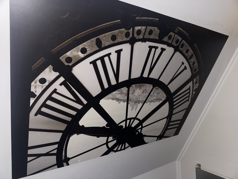 An image shows a large clock face design on a wall, possibly a wallpaper or mural