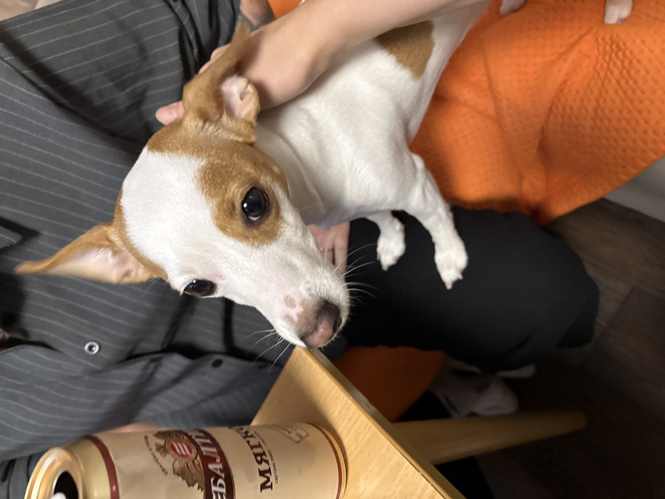 A tan and white dog is being held by a person wearing a grey shirt. Another person wearing black pants sits next to an orange cushion. A table with a can of Балтика beer is in the foreground. The dog's face is close to the can.