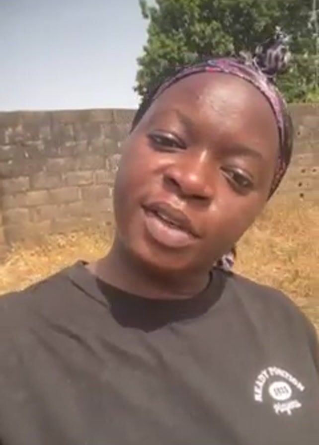 A woman in a black t-shirt and patterned headscarf is the focal point of the video. She is standing outdoors on a dry, grassy lawn with a brick wall serving as a backdrop. A leafy tree and a water tower are visible in the background. The woman speaks directly to the camera.